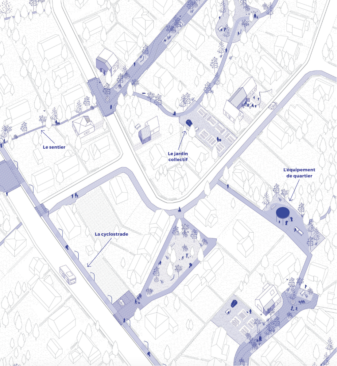 D’un parcellaire entièrement privatisé, dépendant d’une infrastructure pesante et peu efficiente, nous explorons les possibilités de reconfigurer ces quartiers vers plus de mise en commun. Ces pistes sont ouvertes, et nous revendiquons ici que la description est nécessaire et suffisante à la discussion. Ce travail de représentation et l’exposition qui a eu lieu ont pour ambition d’éveiller les imaginaires par le projet. Grâce au dessin, à la cartographie, on donne à voir une forme de systématisation d’espaces, d’initiatives, de projets, qui existent déjà sur le terrain, sous des formes plus éparses, comme autant de laboratoires qui vont dans le sens des transitions souhaitées. Mettre en lumière le déjà-là, raisonner sur sa capacité à devenir structurel, permet de s’en saisir comme d’un levier pour aller plus loin. Forger une crédibilité à cet imaginaire a donc été la première étape de la recherche ; l’objectif était de révéler des opportunités, montrer des possibilités sans chercher à être ni conclusif ni dogmatique.