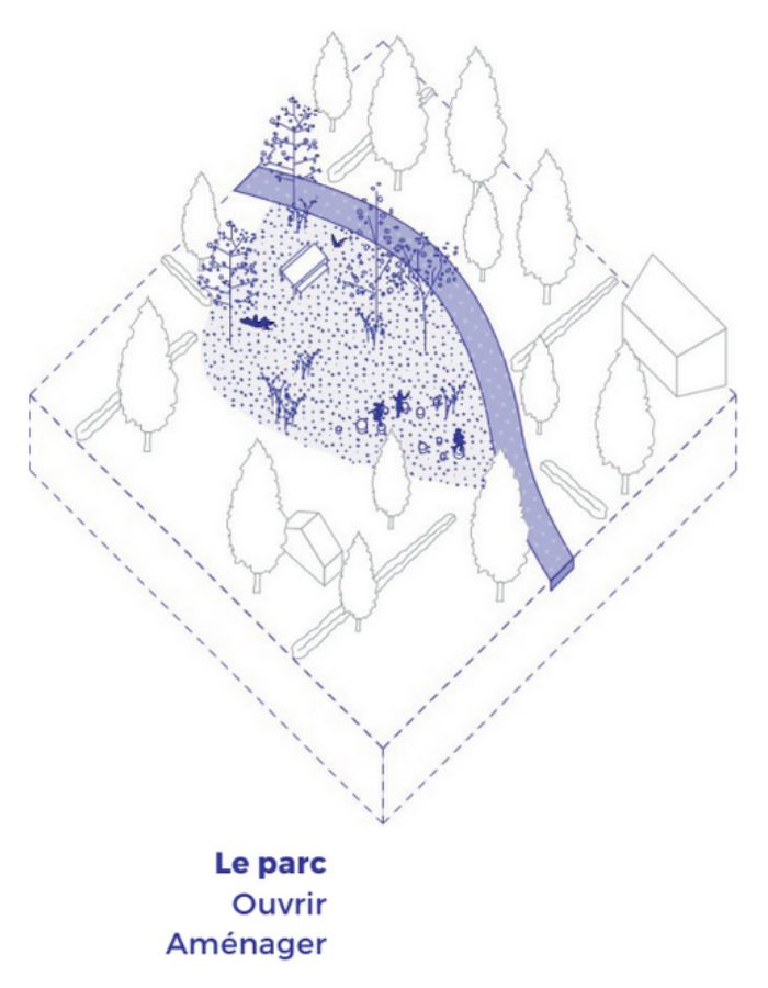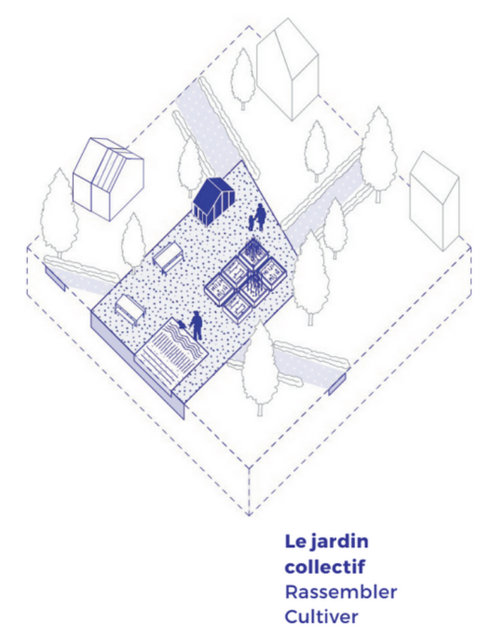 D’un parcellaire entièrement privatisé, dépendant d’une infrastructure pesante et peu efficiente, nous explorons les possibilités de reconfigurer ces quartiers vers plus de mise en commun. Ces pistes sont ouvertes, et nous revendiquons ici que la description est nécessaire et suffisante à la discussion. Ce travail de représentation et l’exposition qui a eu lieu ont pour ambition d’éveiller les imaginaires par le projet. Grâce au dessin, à la cartographie, on donne à voir une forme de systématisation d’espaces, d’initiatives, de projets, qui existent déjà sur le terrain, sous des formes plus éparses, comme autant de laboratoires qui vont dans le sens des transitions souhaitées. Mettre en lumière le déjà-là, raisonner sur sa capacité à devenir structurel, permet de s’en saisir comme d’un levier pour aller plus loin. Forger une crédibilité à cet imaginaire a donc été la première étape de la recherche ; l’objectif était de révéler des opportunités, montrer des possibilités sans chercher à être ni conclusif ni dogmatique.
